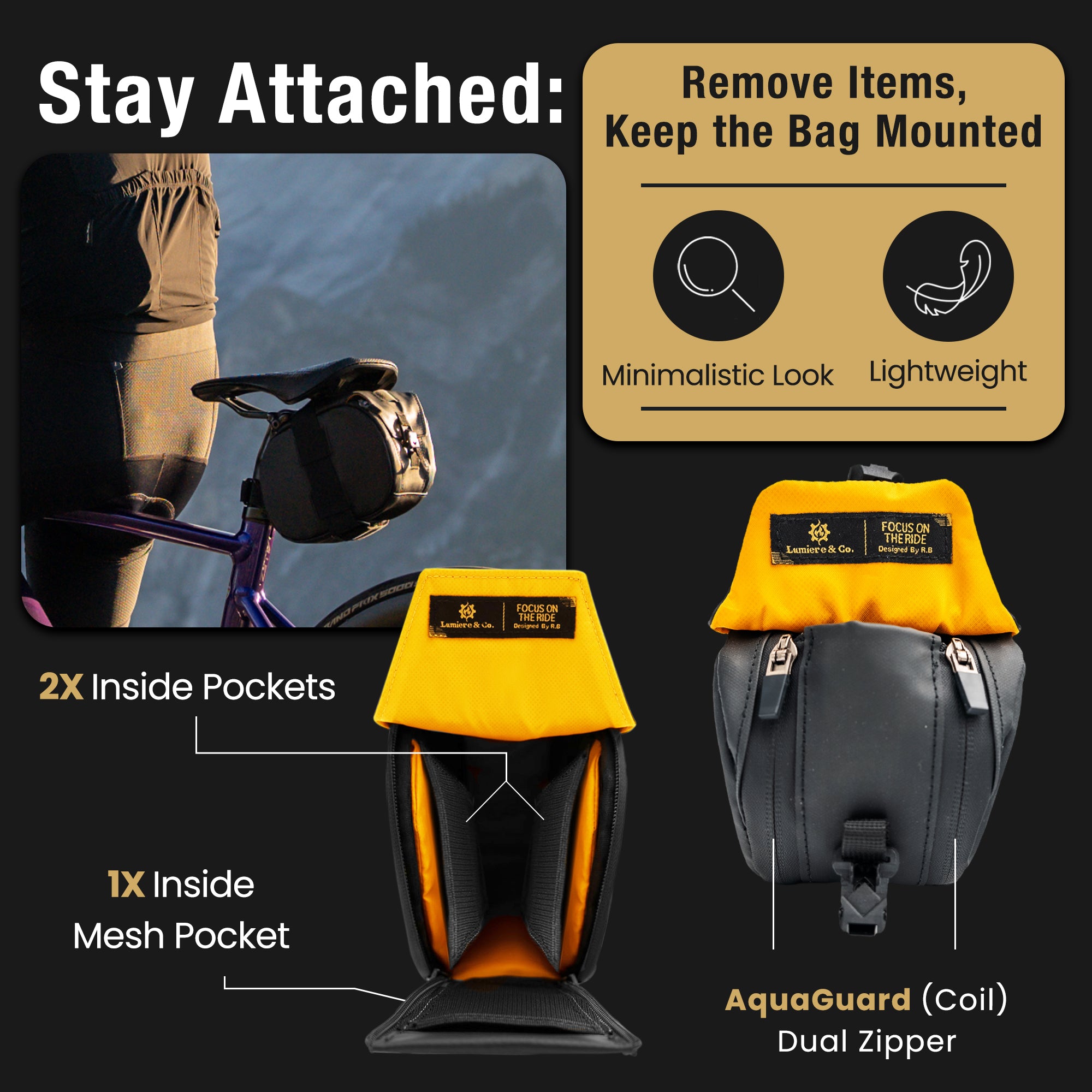 The Falcon’s low profile design locks tight to your saddle rails, so it does not sway or bounce on climbs or descents.